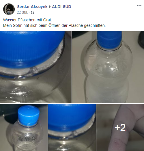 Der Vorwurf des Verbrauchers: „Mein Sohn hat sich beim Öffnen der Flasche geschnitten“, erklärt er auf Facebook. Angehängt sind vier Fotos der Wasserflasche sowie zwei Nahaufnahmen der Schnittwunden, die durch das Öffnen der Flaschen entstanden sein sollen.